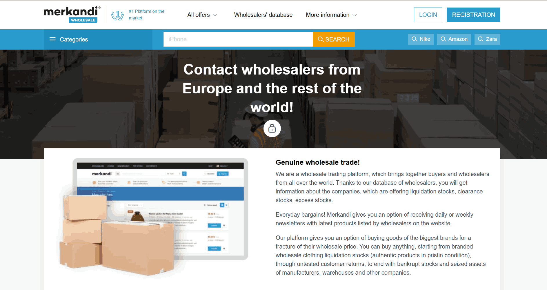 Unlike the platforms above, Merkandi is a B2B marketplace focused on stock, surplus inventory, and liquidation goods. The catalog is extensive — from footwear to chemicals and electronics. Products are often sold in lots or full pallets.