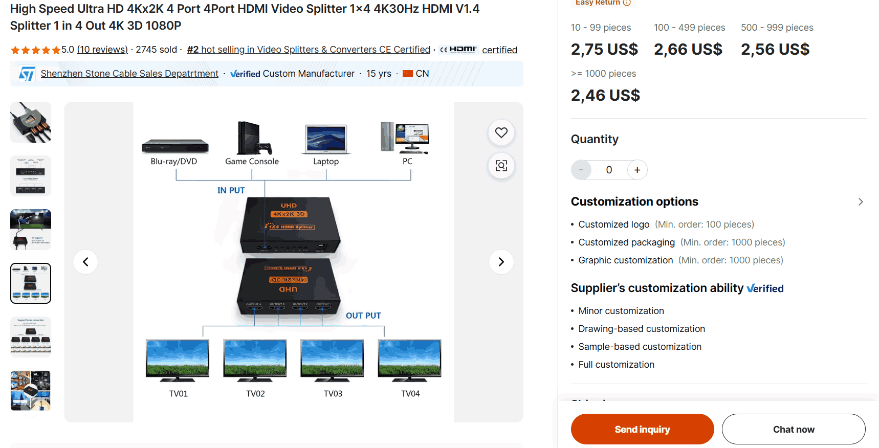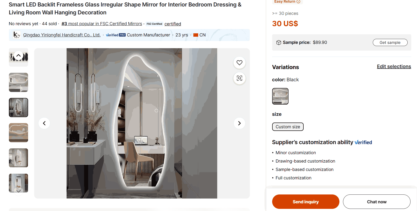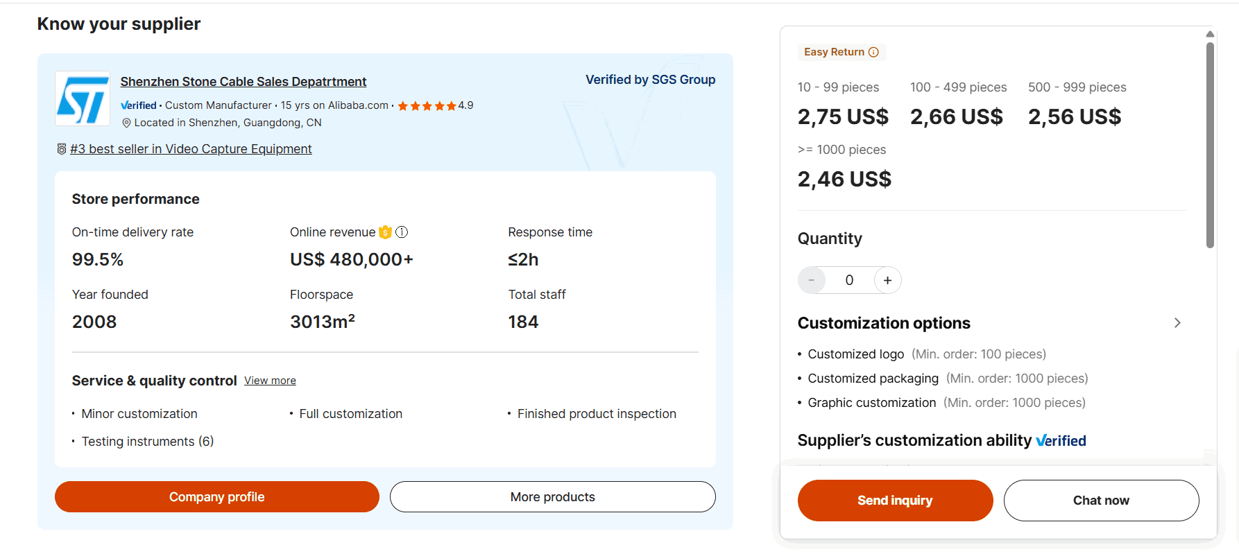 You can also click the “Chat now” button to message the seller. You can negotiate for several samples, customization options, and the size of the test batch. Since Alibaba focuses on export, company representatives generally have a good command of English. If you are satisfied with the sample quality, proceed with ordering a small batch.